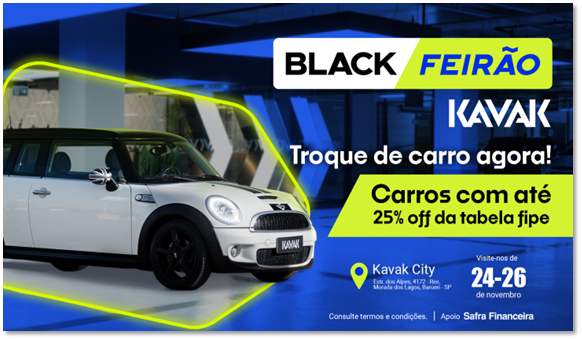 A Kavak Brasil, líder no mercado de seminovos de alta qualidade, está preparando uma oportunidade imperdível para que você finalmente adquira o carro dos seus sonhos. É o Black Feirão Kavak de seminovos, um evento agendado entre os dias 24 e 26 de novembro, na Kavak City, em São Paulo.