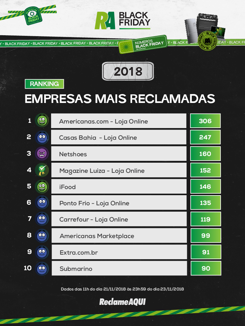Confira os rankings recentes de empresas com mais queixas na Black Friday, segundo o ReclameAqui: