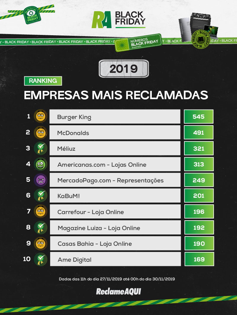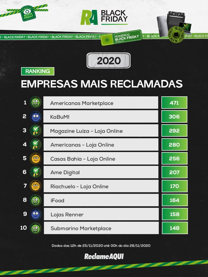 De acordo com o ReclameAqui, estar entre os nomes com maior número de reclamações, contudo, não significa que uma empresa é ruim. Isso porque contratempos acontecem, ainda mais em uma época com alto volume de pedidos, como a Black Friday. Por isso, o site reforça que o importante é que o consumidor tenha o seu pedido atendido e resolvido de maneira eficiente.