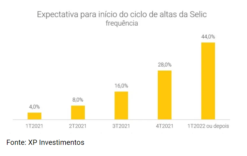 Na avaliação de 44% dos consultados, a taxa básica de juros deve subir no primeiro trimestre de 2022 ou depois; 28% projetam a elevação para os últimos três meses de 2021; 16%, para o terceiro trimestre do ano que vem; e 8%, no segundo trimestre de 2021.