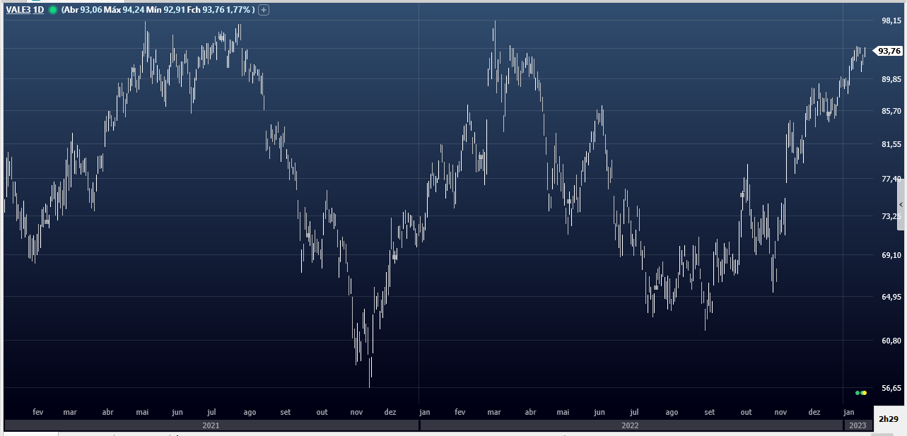 Com a alta de 1,9%, registrada no pregão desta quarta-feira (18), até as 16h00, as ações da mineradora já valem R$ 93,89, abrindo espaço para um possível ponto de rompimento de “resistência” de suas ações.