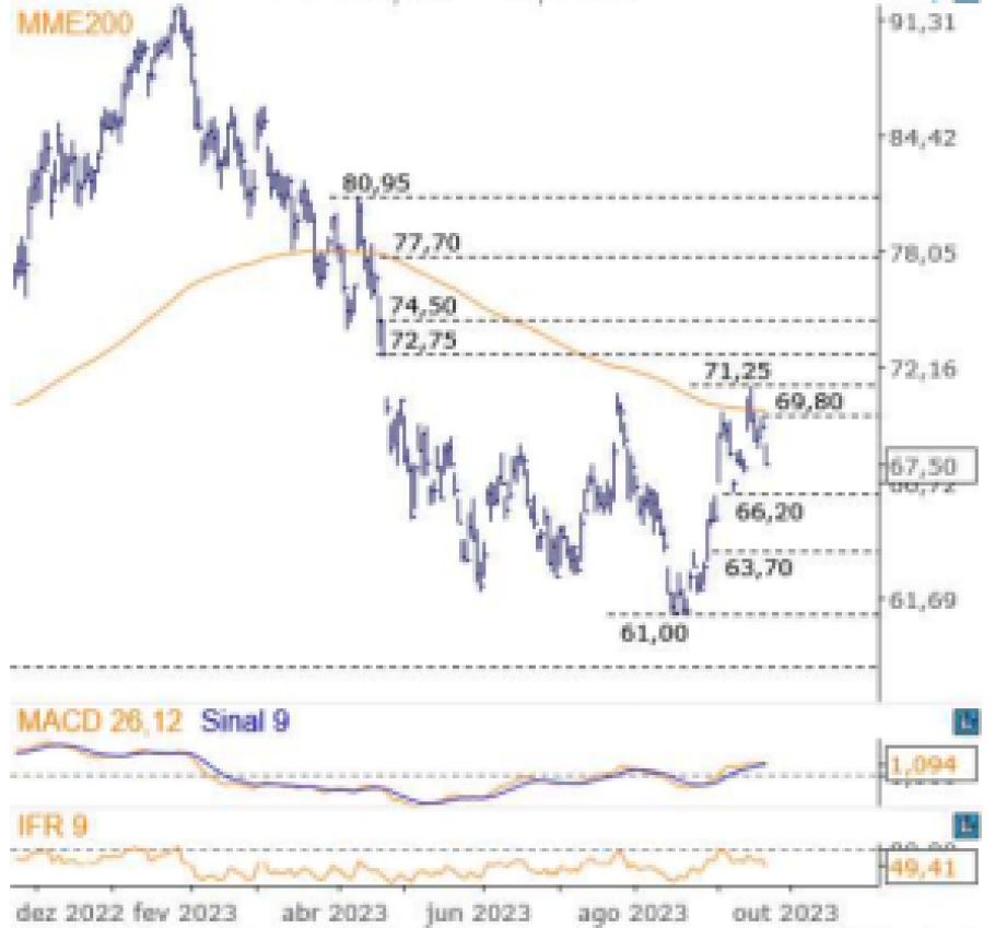 No sentido inverso, no lado da queda, afirmam que “caso o suporte de R$ 66,20 seja perdido, abrirá espaço para quedas até R$ 63,70 e R$ 61,00, na mínima do ano.”