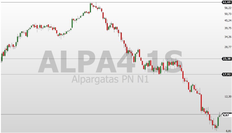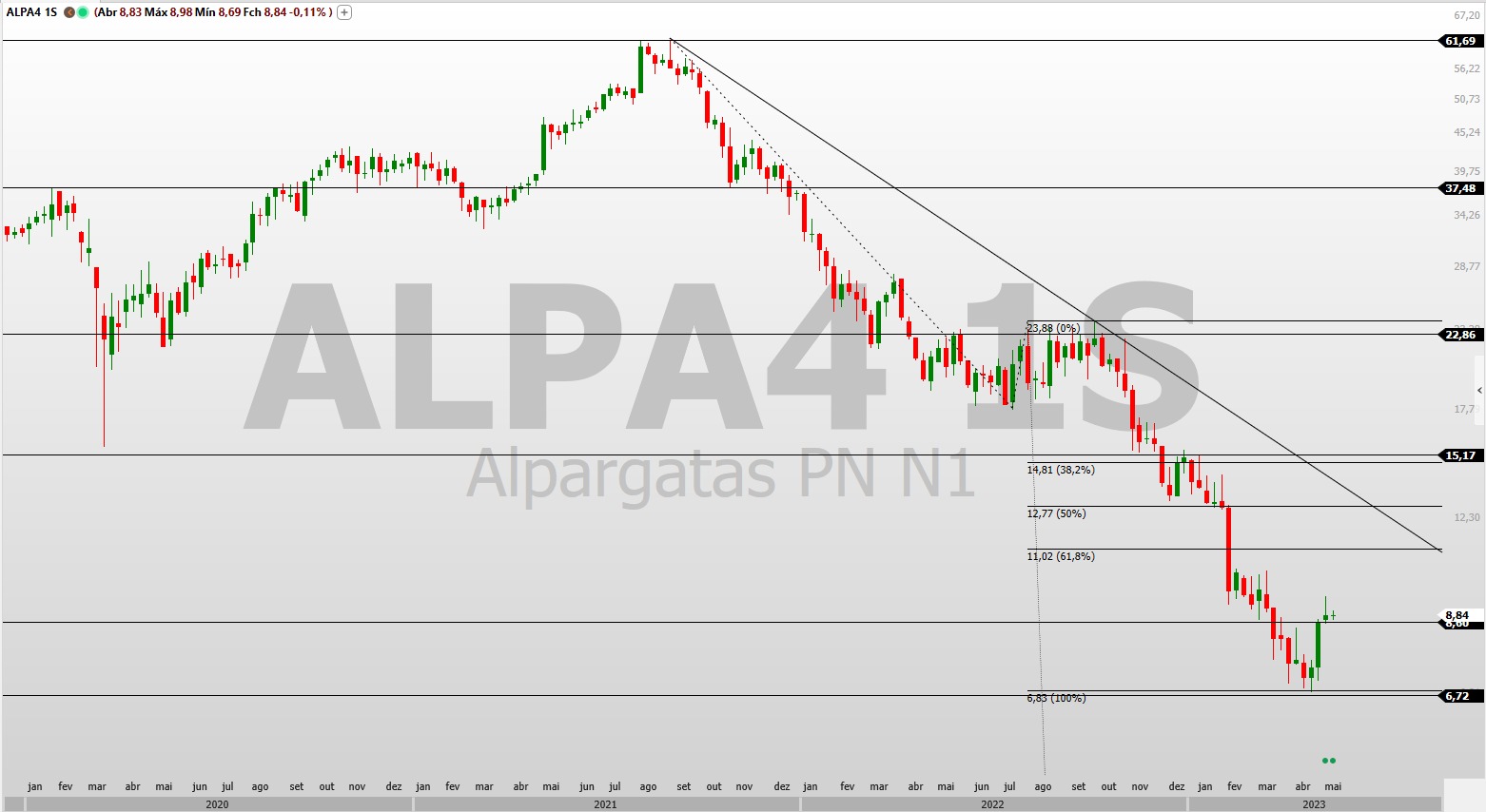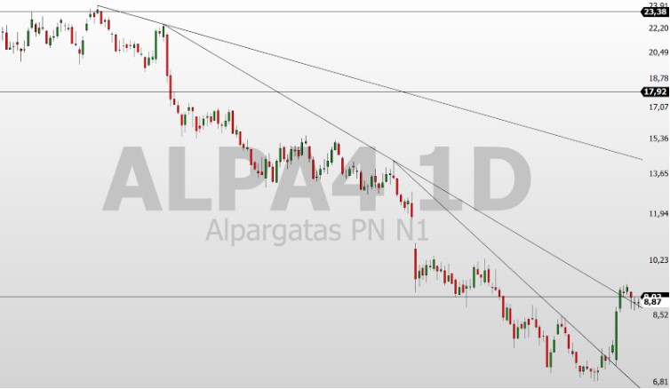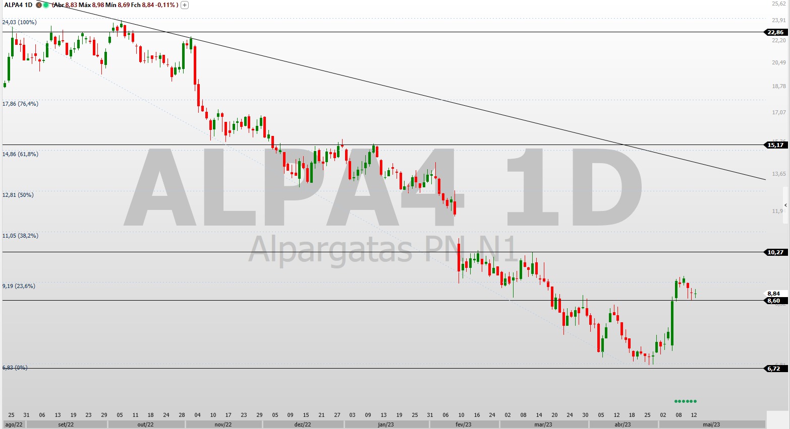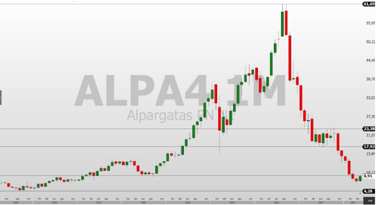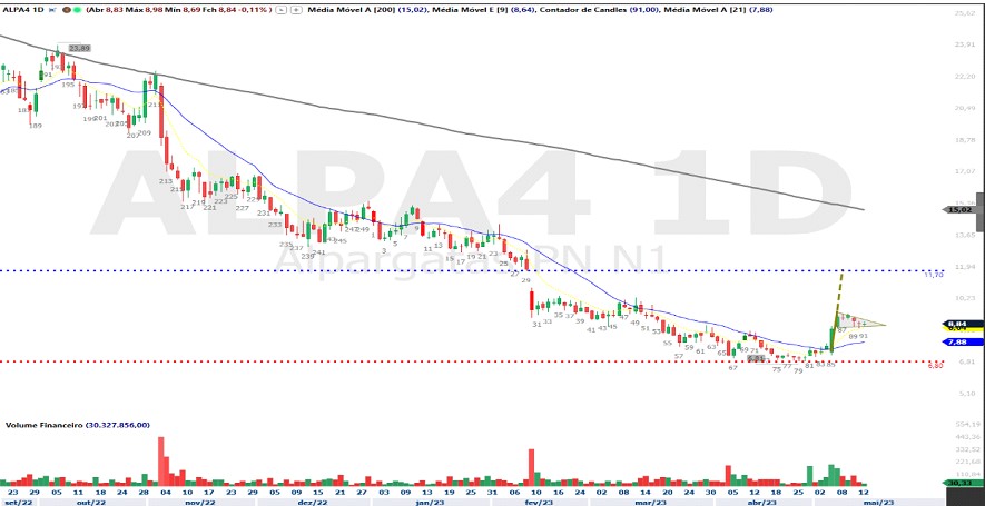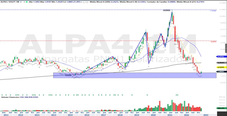 Por fim, o analista chefe da Wisir Research, Gustavo Massotti, destaca que a Alpargatas cedeu mais de 85%, após marcar seu topo histórico, em agosto de 2021. No curto prazo, porém, o ativo “tenta armar uma bandeira de alta, que têm como projeção o fechamento do gap aberto na região dos R$ 11,70.”