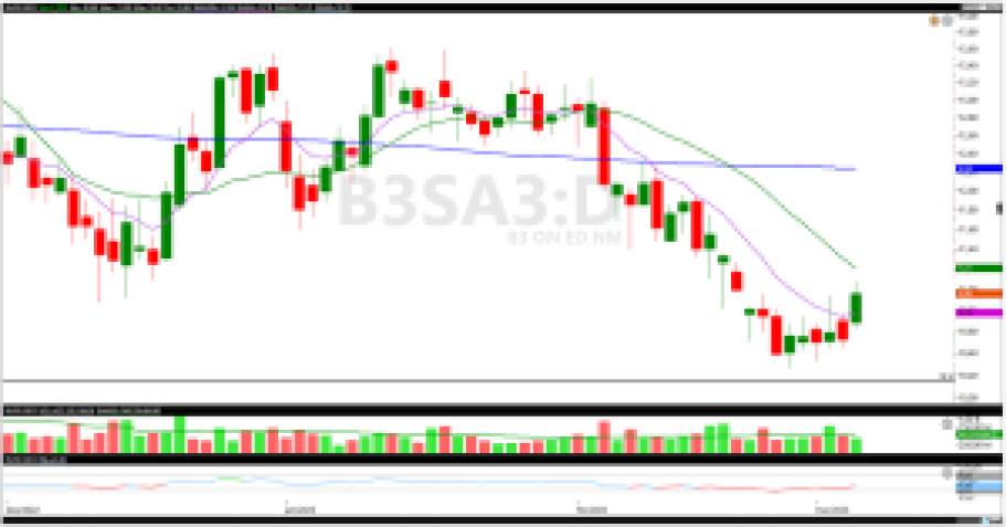 Após esse ponto, de R$ 11,40, então, as ações da B3 podem buscar uma região de resistência na média de 200 períodos, nos R$ 18,78.