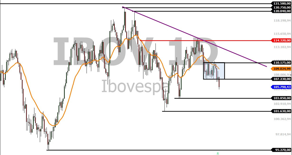 Com o rompimento desse suporte, conforme ele, uma projeção de Fibonacci mostra que um patamar de preço provável para pausar as quedas deve ser próximo do fundo anterior, em 104.460 e 103.870 pontos.