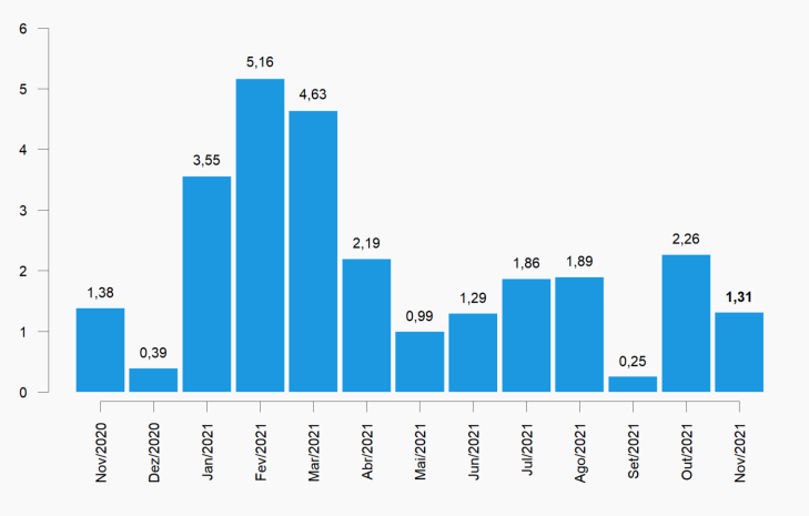 Número ficou abaixo do do registrado em outubro (2,26%). No acumulado no ano, o índice atingiu 28,36%, e o no acumulado em 12 meses, 28,86%.