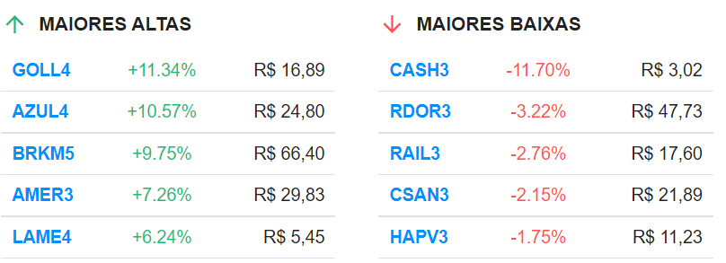14h45 – Aéreas têm maiores altas do Ibovespa; Gol (GOLL4) sobe 10,58% e Azul (AZUL4) avança 9,59%