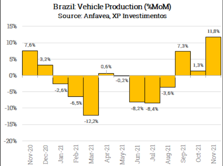 Com relação aos preços do aço, o banco espera uma correção média de 10% em 2022 no mercado interno. No entanto, o BBI ressalta que os contratos com montadoras estão sendo negociados com um aumento de 50-40% para janeiro e talvez uma magnitude menor para os contratos do segundo trimestre de 2022.a