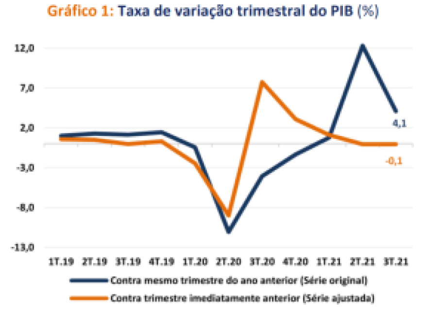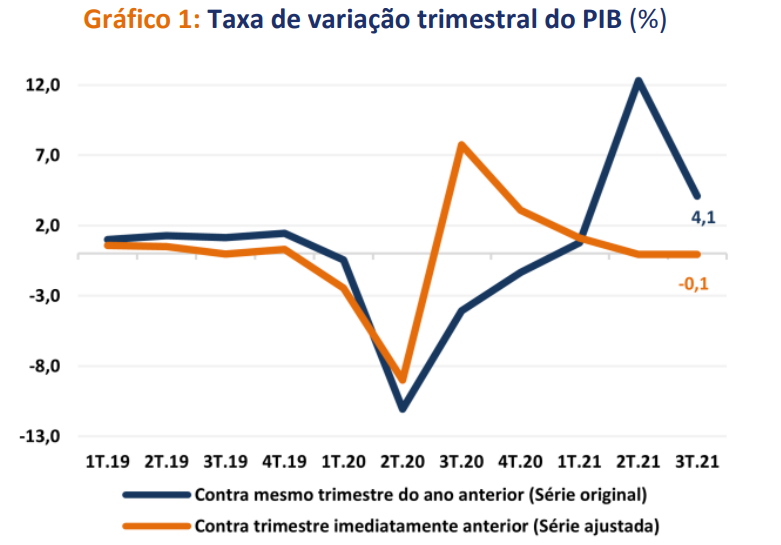 Conforme o Monitor do PIB do Ibre/FGV, na comparação com o 3º trimestre de 2020, o PIB cresceu 4,1%. Apenas em setembro, ante agosto, com ajuste sazonal, houve alta de 0,3%.