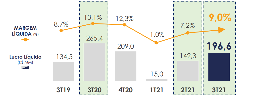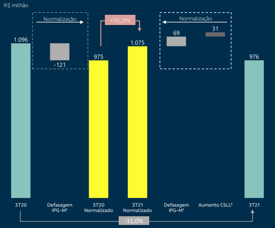 Segregando o efeito do descasamento temporal na atualização de ativos e passivos vinculados ao IGP-M na Brasilprev, que é nulo para o resultado ao longo do tempo, o lucro líquido teria crescido 7,1% no terceiro trimestre, diz a empresa.