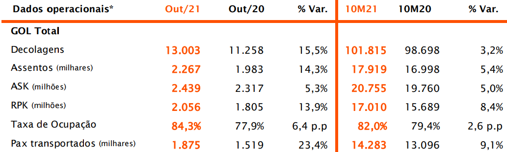 O banco apontou para o fato de que a demanda doméstica avançou 12% em outubro em comparação com o mês imediatamente anterior, apesar de ter ficado 33% abaixo do patamar de outubro de 2019, antes dos efeitos da pandemia. A capacidade avançou 0,5% na comparação mensal e caiu 34% frente a outubro de 2019. A taxa de ocupação (“load factor“, em inglês) ficou em 84,3% em outubro, alta de 5,1 pontos percentuais na comparação mensal e de 1,5 ponto percentual frente a outubro de 2019.