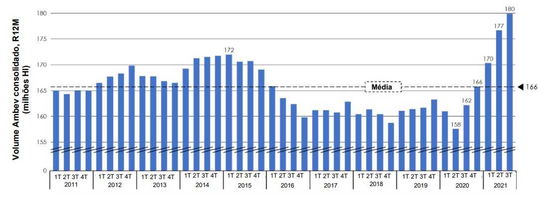Para o banco, os resultados do 3T21 da Ambev vieram muito fortes, com Ebitda 8% acima do consenso e a empresa reportando crescimento do volume de cerveja brasileira de 7%.