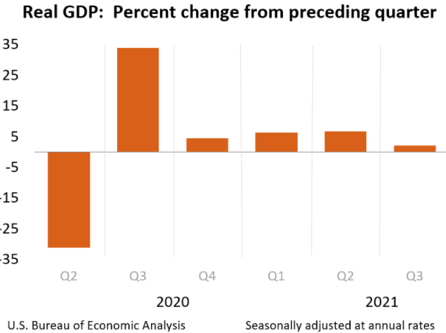 Conforme o Bureau of Economic Analysis, o PIB dos EUA desacelerou ganhos reais de 6,7% (2T21) para 2% (3T21), pelo ressurgimento de casos de Covid-19, resultando em novas restrições e atrasos na reabertura de estabelecimentos em algumas partes do país.