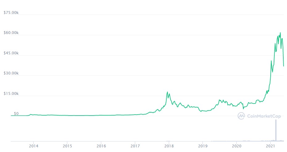 A segunda grande correção do preço tem ocorrido neste momento. Em 14 de abril, o Bitcoin atingiu a máxima na casa dos US$ 64 mil e, nas últimas semanas, entrou em um forte movimento negativo, chegando a atingir por um breve momento os US$ 30 mil no dia 19 de maio.