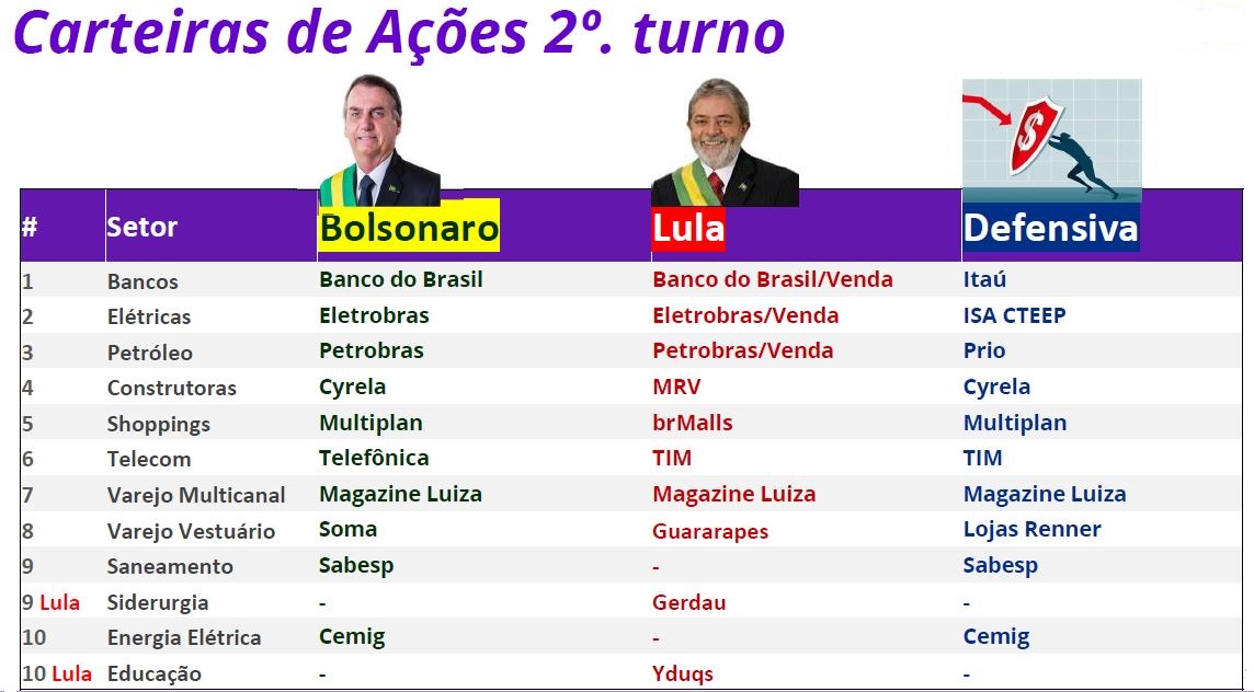 Mas, além delas, outras companhias podem ser mais ou menos beneficiadas se Lula for eleito ou se Bolsonaro ganhar um novo mandato, enquanto é possível também ter uma carteira defensiva para os dois cenários.