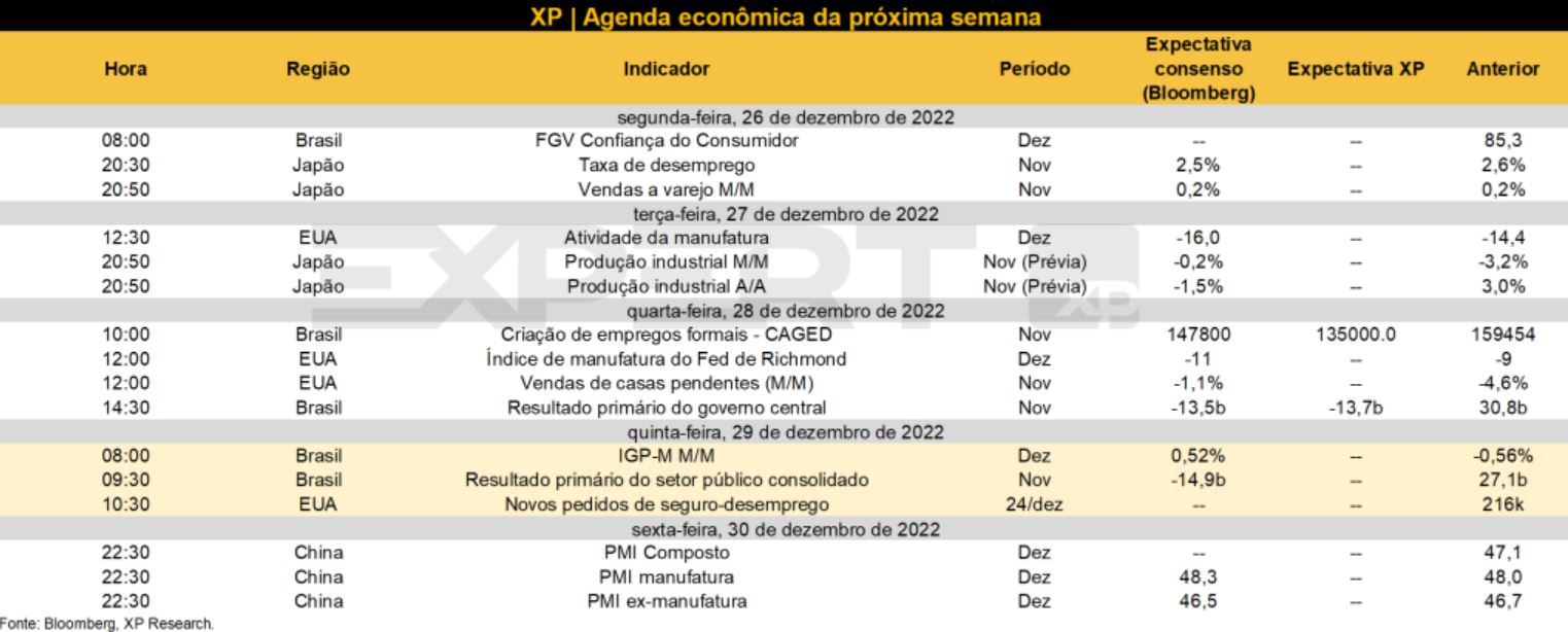 A última semana de 2022 será pouco agitada de indicadores econômicos e com a agenda em Brasília menos movimentada com a entrada em recesso do Congresso, mas ainda trará importantes acontecimentos para os investidores ficarem de olho.