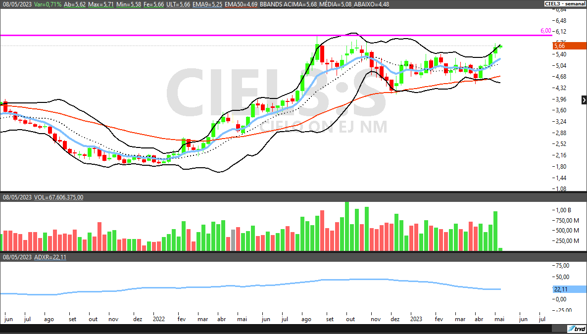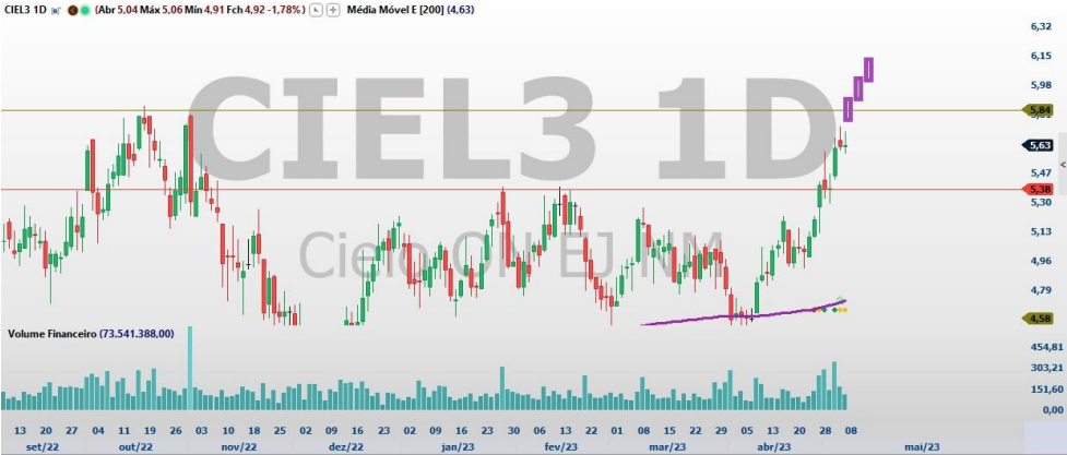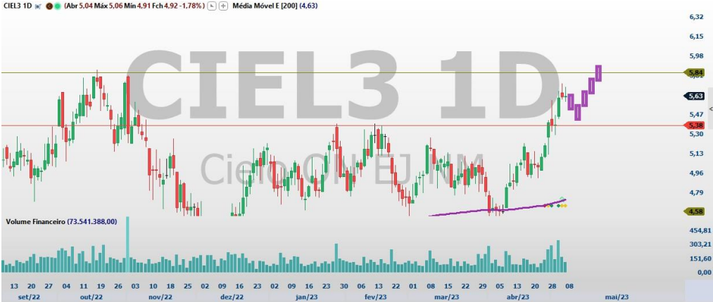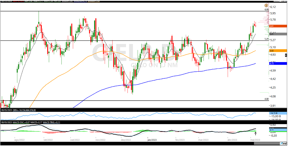 Segundo a Levante, em relatório assinado por Enrico Cozzolino, as ações da empresa, ajudadas por bons resultados divulgados recentemente, fizeram o rompimento de importante nível de preços na faixa, dos R$ 5,40, fazendo máximas recentes em região de topo visitada somente em 2022.