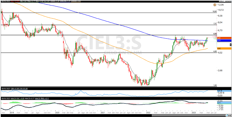 “Agora, o ativo pode estabelecer topos e fundos ascendentes, caso supere o topo nos R$ 6,00, zona de resistência que faz influência no preço há cerca de 37 semanas”, acrescenta.