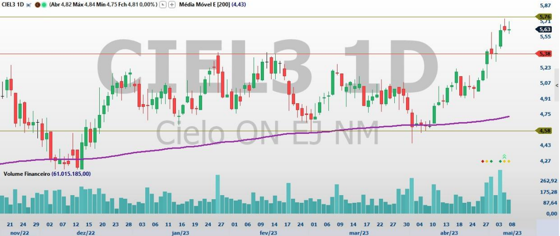As ações da Cielo (CIEL3) acumulam impressionantes 96,4% de ganhos nos últimos doze meses na Bolsa e, em 2023, já contam com valorização de 10,1%. No pregão desta terça-feira (9), as ações registraram nova valorização, de 1,42%, cotadas a R$ 5,71.