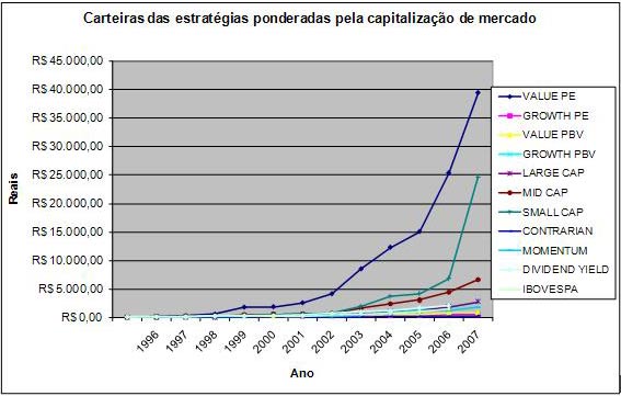 O gráfico do desempenho das carteiras mostra que a estratégia de Valor, que seleciona ações usando o múltiplo Preço/Lucro (VALUE PE), foi a de melhor desempenho (em termos de retorno absoluto) em todo período de dez anos de análise, superando não somente as outras estratégias mas também o índice BOVESPA. Pelo gráfico quem tivesse investido R$ 100 no início de 1996 obteria R$ 39.485,64 no final de 2007.