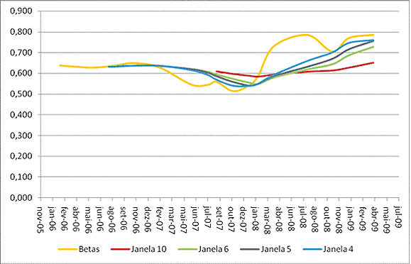 Podemos notar na Figura 1 que mesmo as janelas móveis, que constumam suavizar as variações, também mostram que a variabilidade dos betas é muito grande.