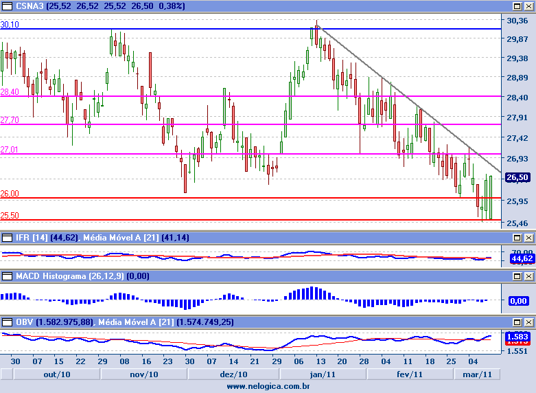 Em tendência secundária de baixa, mas primária de indefinição, os papéis ordinários da CSN (CSNA3) voltaram a testar a base da congestão que vem desde julho do ano passado, nos R$ 26,00, confirmando o importante suporte.