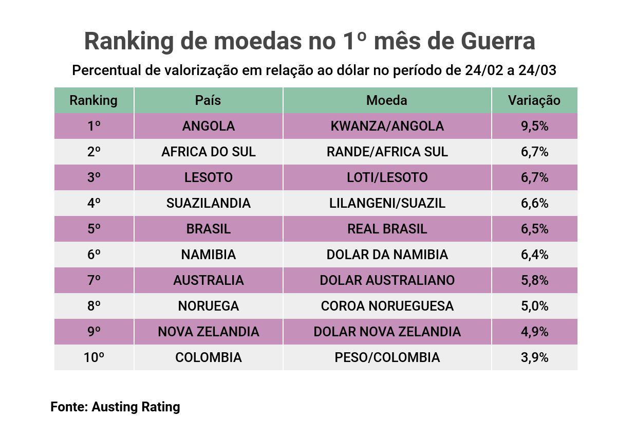 No entanto, Lima acredita que se a incerteza global acelerar e extensão do mundo colocar a guerra em risco de recessão, a tendência poderia se inverter. “Nesse caso, é quase certo que haveria um fortalecimento do dólar em relação às principais moedas. Mas tudo tudo vai depender da escalada desses riscos”, afirma Lima.