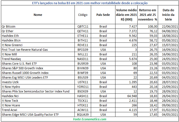 E segundo um levantamento feito pela consultoria Economatica, quatro desses ETFs cripto são os líderes em rendimento dentre todos lançados em 2021 na Bolsa brasileira.