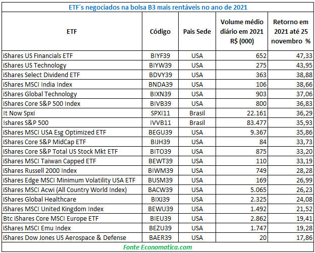 Nessa lista, a liderança este ano até 25 de novembro é do iShares US Financials, com alta de 47,33%, seguido pelo iShares US Technology, que sobe 43,95%. Confira: