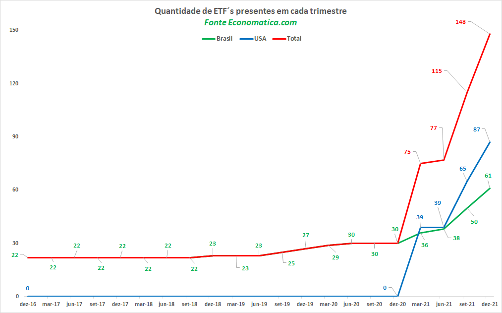 De acordo com a Economatica, o Brasil chegou a marca de 148 ETFs disponíveis na B3, sendo 87 estrangeiros e 61 brasileiros, sendo que o movimento de crescimento ganhou força principalmente no início deste ano.