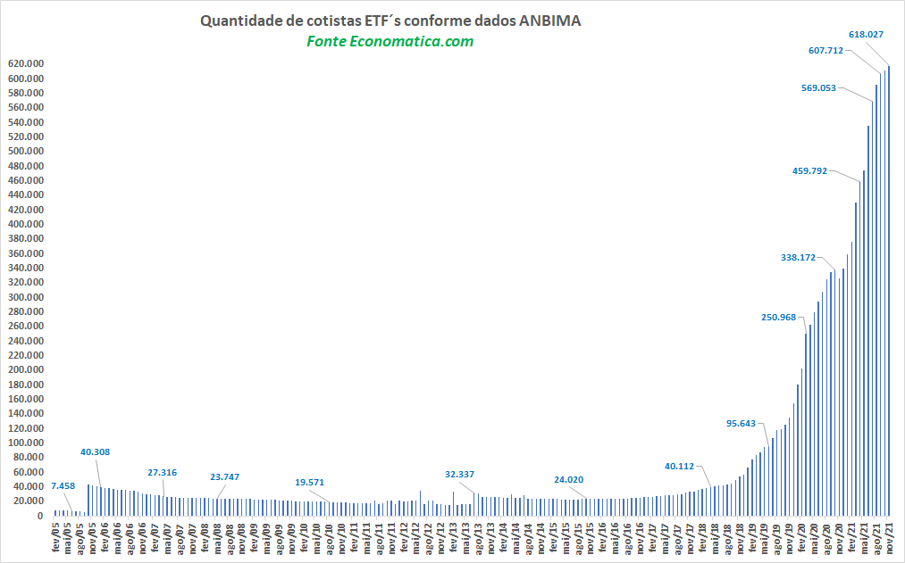 Esse cenário também levou a um forte crescimento na quantidade de cotistas em ETF no Brasil, que ultrapassou a marca de 600 mil em setembro, mantendo-se acima desse patamar até novembro, quando atingiu 618.027 cotistas, a maior quantidade já registrada.