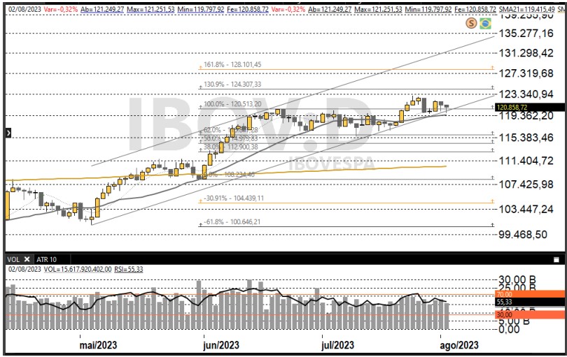 Ibovespa fechou ontem com queda de 0,32%, aos 120.858,72 pontos