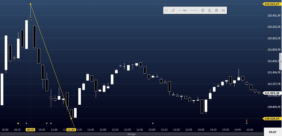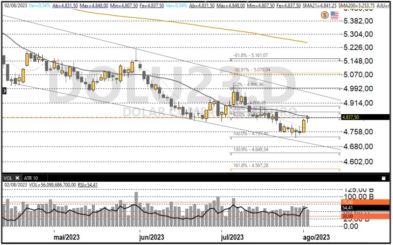 Ibovespa Futuro fecha com queda de 0,36%, aos 120.710 pontos; e dólar futuro, com alta de 2,20%, a R$ 4,9440