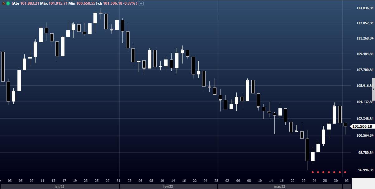 Os índices futuros dos EUA sobem nesta manhã de terça-feira, com investidores avaliando um aumento nos preços do petróleo promovido pelo corte de produção da Opep+ e à espera de dados do mercado de trabalho no mês de fevereiro. O relatório de empregos JOLTS sai às 11h, com expectativa de 10,4 milhões de vagas de trabalho em aberto no mês de fevereiro.