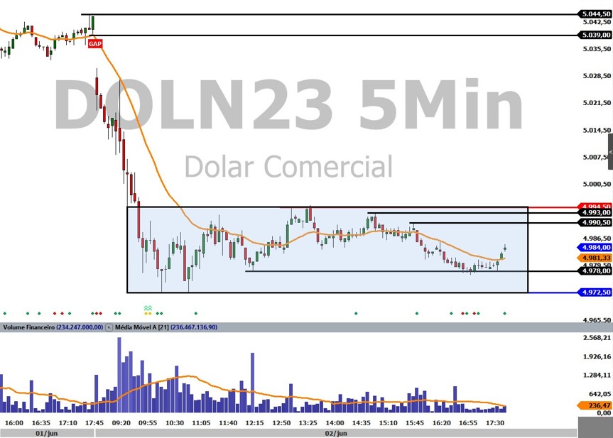 Ibovespa Futuro fecha com queda de 0,21%, aos 113.005 pontos; e dólar futuro, com queda de 0,58%, a R$ 4,9560
