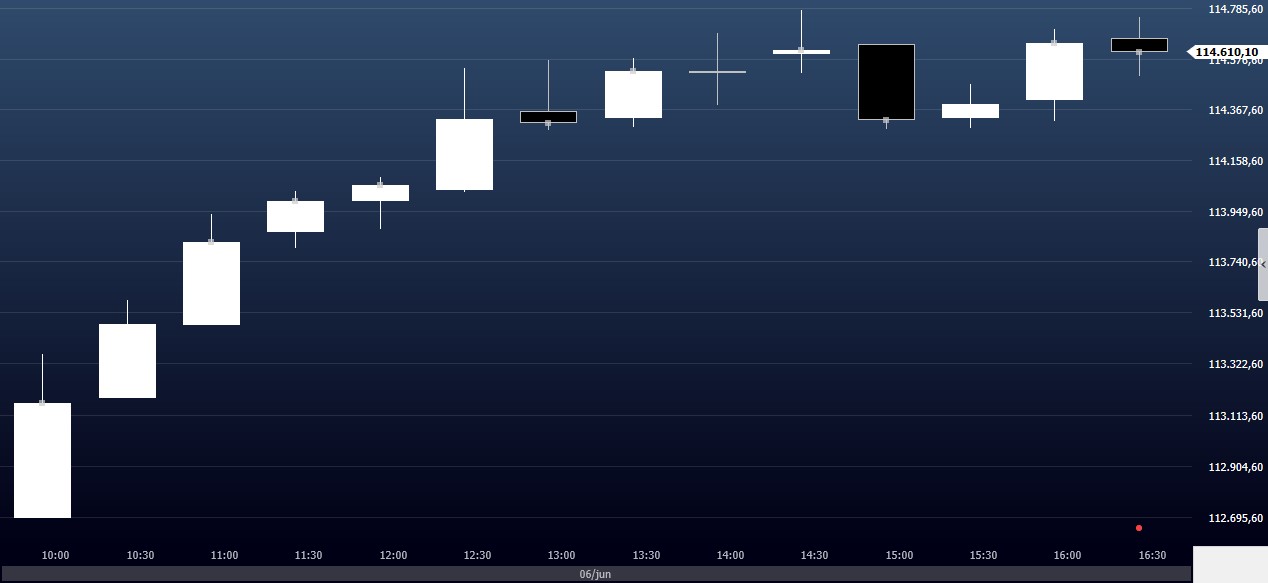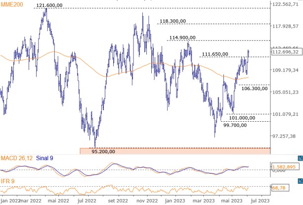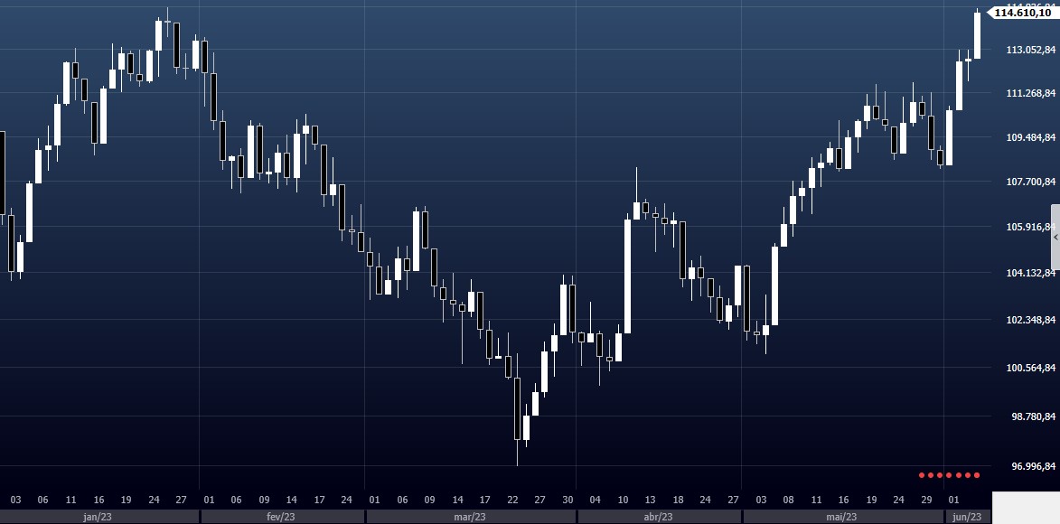 É a quarta alta seguida do Ibovespa, mantendo junho com apenas pregões positivos. Com a alta de hoje, o Ibovespa fecha no maior patamar do ano. O último dia que o índice fechou acima disso foi em 8 de novembro de 2022, com 116.160,35 pontos, alta de 0,71%. No dia seguinte àquele, houve queda de 2,22%, aos 113.580,09 pontos. Os 114 mil só foram retomados em fechamento hoje (em 26 de janeiro de 2023, na máxima, o índice marcou o pico do ano até aqui, com 114.835,35 pontos, mas fechou com 114.177,55).