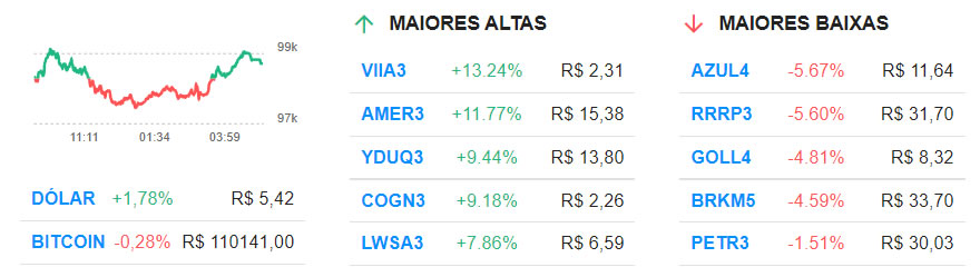 Cogna (COGN3), Locaweb (LWSA3) e Yduqs (YDUQ3) também foram destaque, subindo, na sequência, 9,18%, 7,86%% e 9,44%.