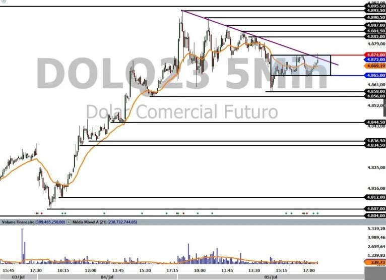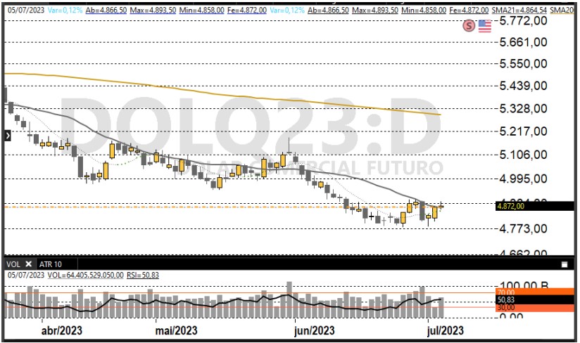 O dólar tem o quarto dia de valorização diante do real nas quatro sessões de julho, na direção contrária da divisa norte-americana na comparação com as principais moedas do mundo: o índice DXY ficou com queda de 0,23%. O câmbio foi fortemente impactado pelo ambiente externo, com a perspectiva cada vez maior de que o Fed volte a adotar uma postura agressiva em sua política monetária, após um novo relatório de emprego mais forte do que o esperado.
