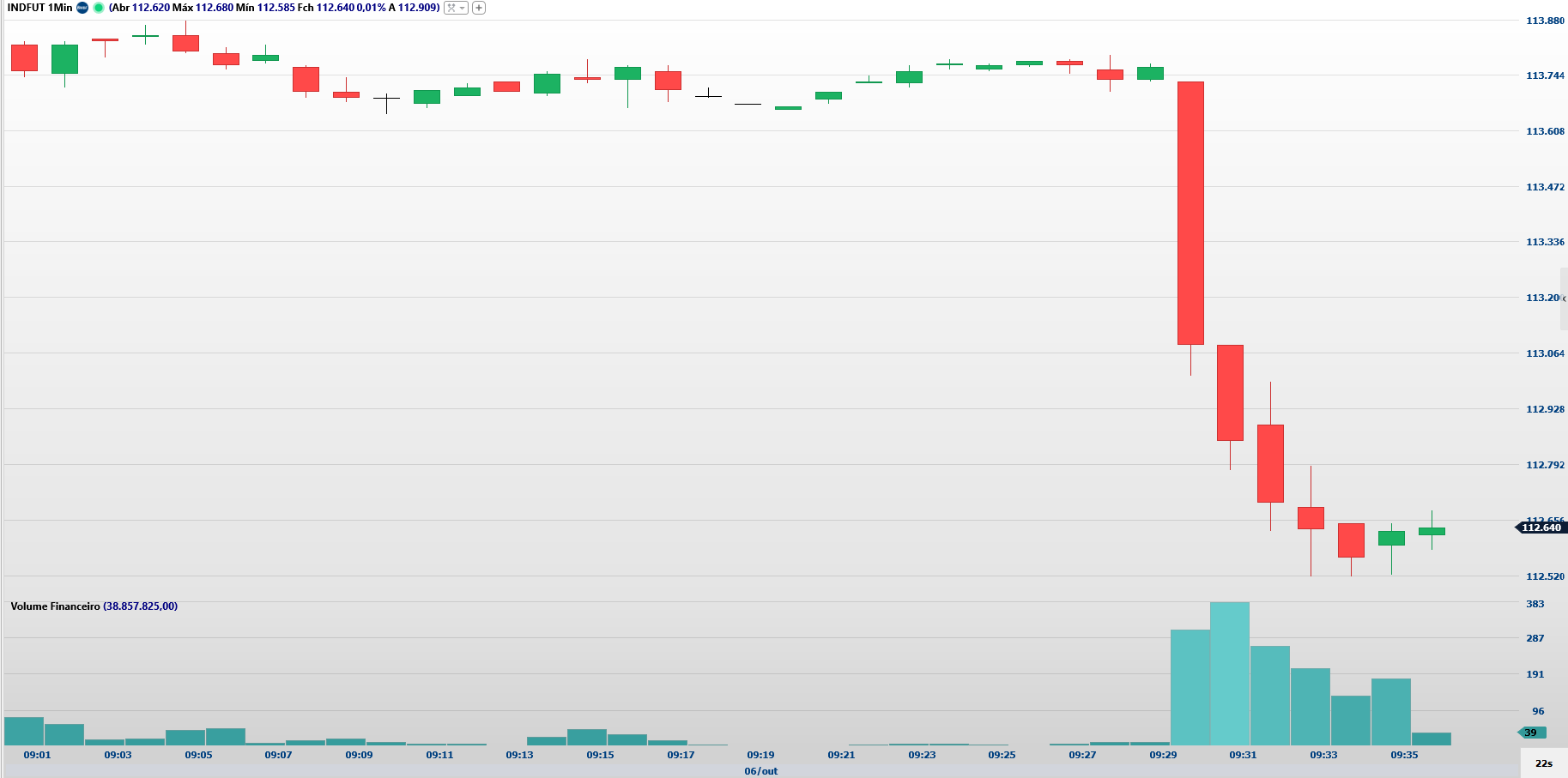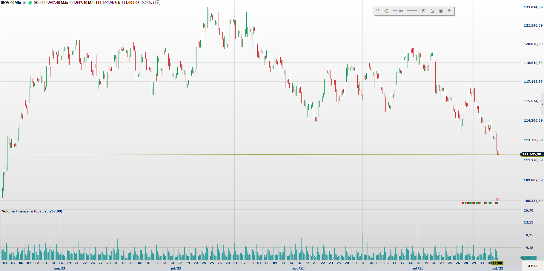 O Ibov está em tendência de baixa pela média de 21 dias e se perder o suporte em 111.700 favorecerá teste dos 108.000 ou 101.000. Teria sinal de recuperação caso feche acima dos 114.360 mirando resistências em 116.900 ou 119.800. Segundo Gilberto Coelho, analista técnico da XP, o candle de fechamento é chamado como candle de dúvida.