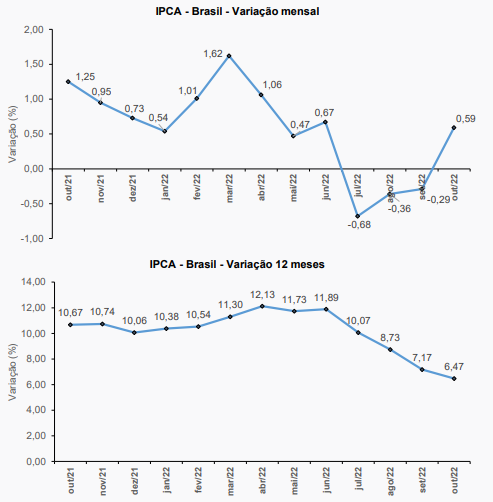 No Brasil, o principal destaque da agenda de indicadores é a divulgação às 9h do IPCA referente a outubro. O número será divulgado às e o consenso Refinitiv prevê variação mensal positiva de 0,47%, interrompendo uma sequência de três meses seguidos de deflação. Às 14h30, Roberto Campos Neto, presidente do BC, tem reunião com representantes da B3. Às 10h, o presidente eleito Lula tem reunião com parlamentares e visita o centro de transição.