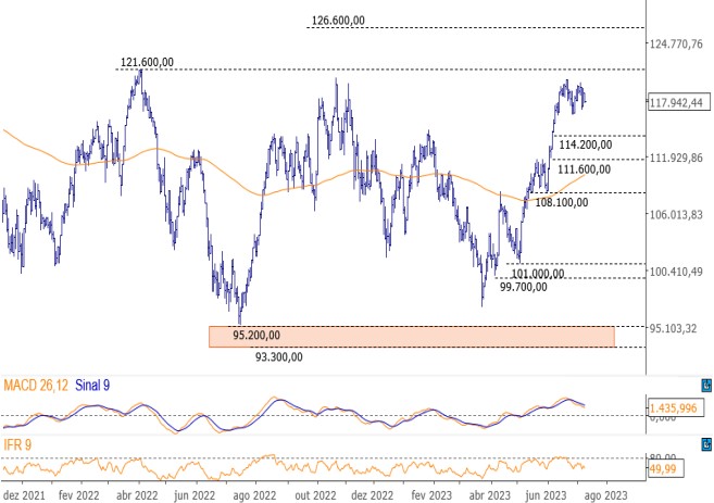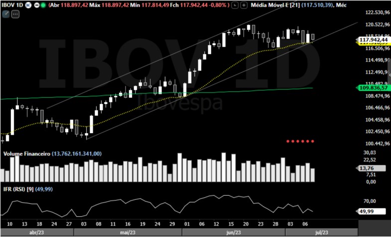Ibovespa fechou ontem com queda de 0,80%, aos 117.942,44 pontos