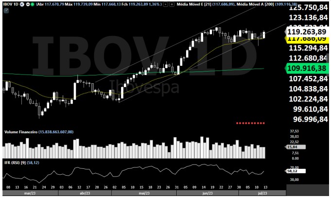 Ibovespa fechou ontem com alta de 1,36%, aos 119.263,89 pontos