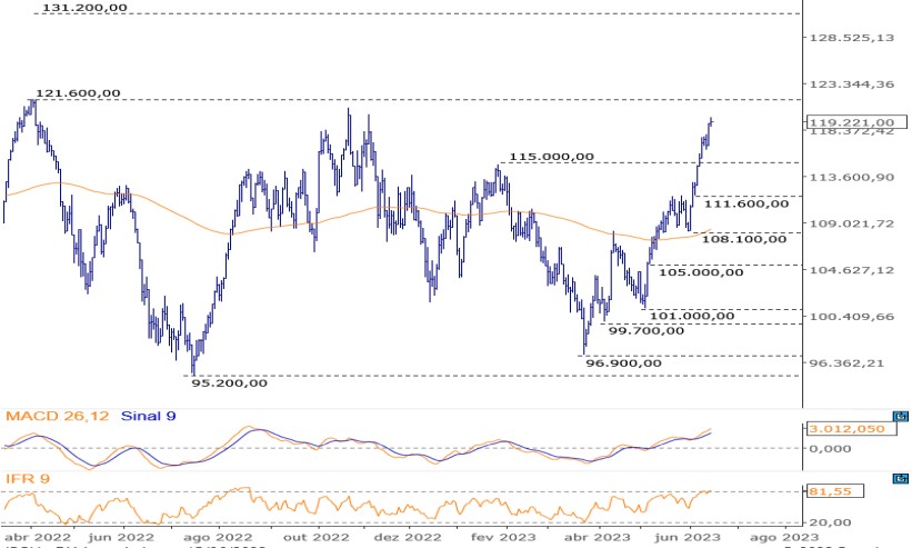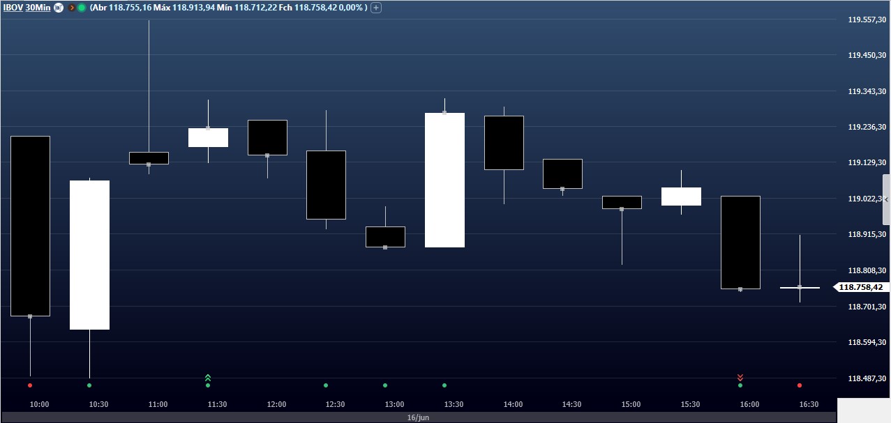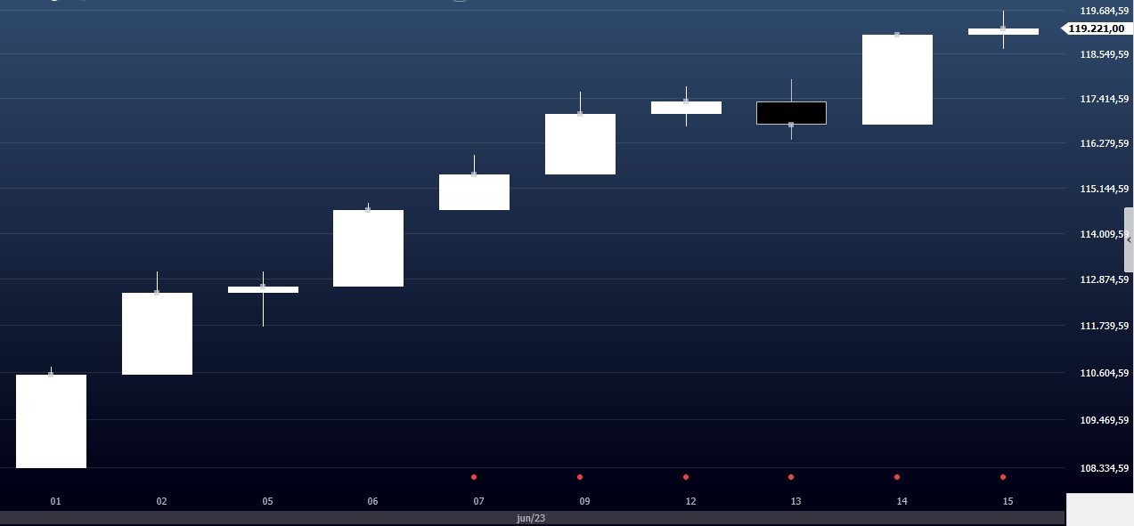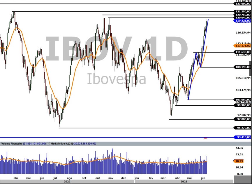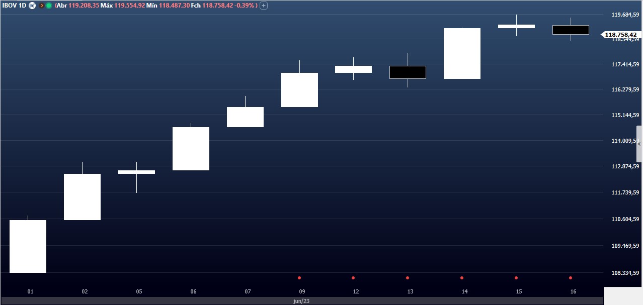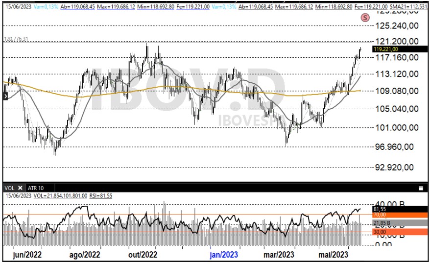 Ibovespa fechou ontem com alta de 0,13%, aos 119.221,00 pontos