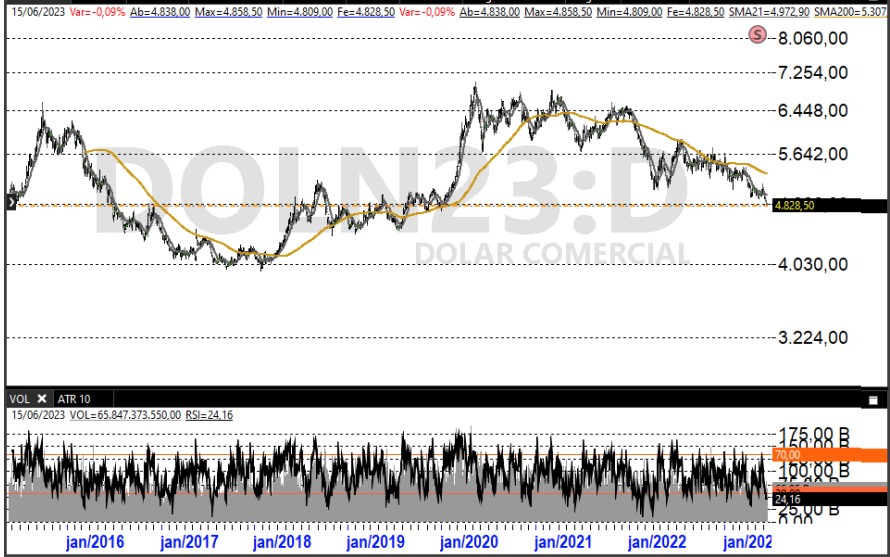 O dólar caiu pela quinta sessão seguida frente ao real, mesmo movimento da divisa norte-americana na comparação com as principais moedas do mundo: o índice DXY ficou com forte queda de 0,80%. O câmbio recuou com a previsão de que o Fed está próximo de encerrar seu ciclo de alta – nos EUA, os Treasuries recuaram por toda a curva.