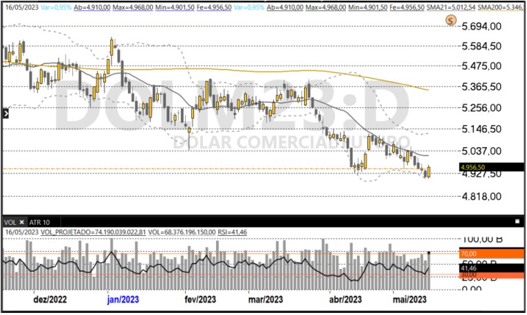 O dólar se desvalorizou frente ao real, voltando à trajetória de queda interrompida ontem. O movimento vai na direção contrária da moeda norte-americana pelo mundo: o índice DXY ficou com mais 0,28%. O dólar até chegou a subir com consistência hoje diante do real, mas os acertos políticos em torno da nova regra fiscal amenizaram o ímpeto e levaram o câmbio para baixo. Enquanto isso, os investidores seguem monitorando a questão do teto da dívida nos EUA.