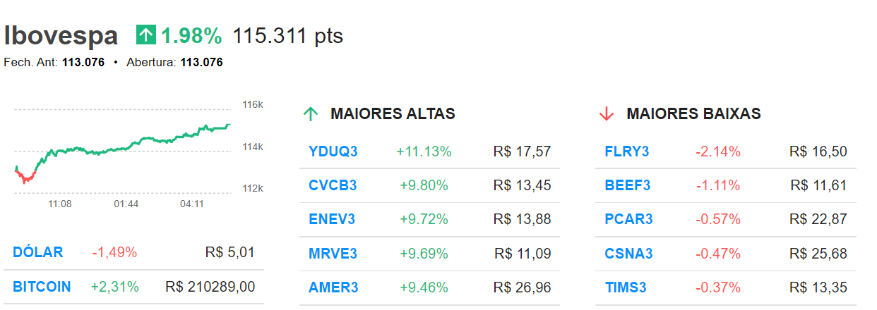 16h55 – Ibovespa fecha em alta preliminar de 1,79%, aos 115.103 pontos