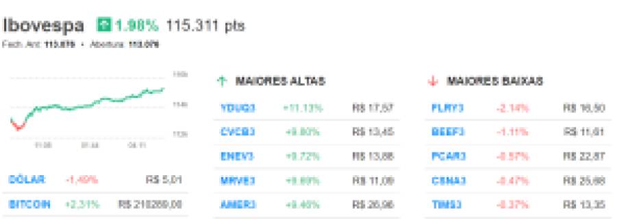 17h19 – Ibovespa fecha em alta de 1,98%, aos 115.310 pontos
