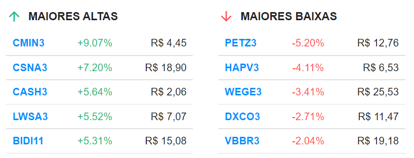 Entre as maiores quedas estão também a Cruzeiro do Sul (CSED3), com queda de 3,55%; Ambipar (AMBP3), com menos 2,73%; Jalles Machado (JALL3), baixa de 2,62%; e Petz (PETZ3), caindo 2,60%.