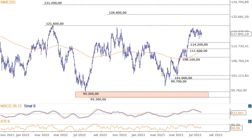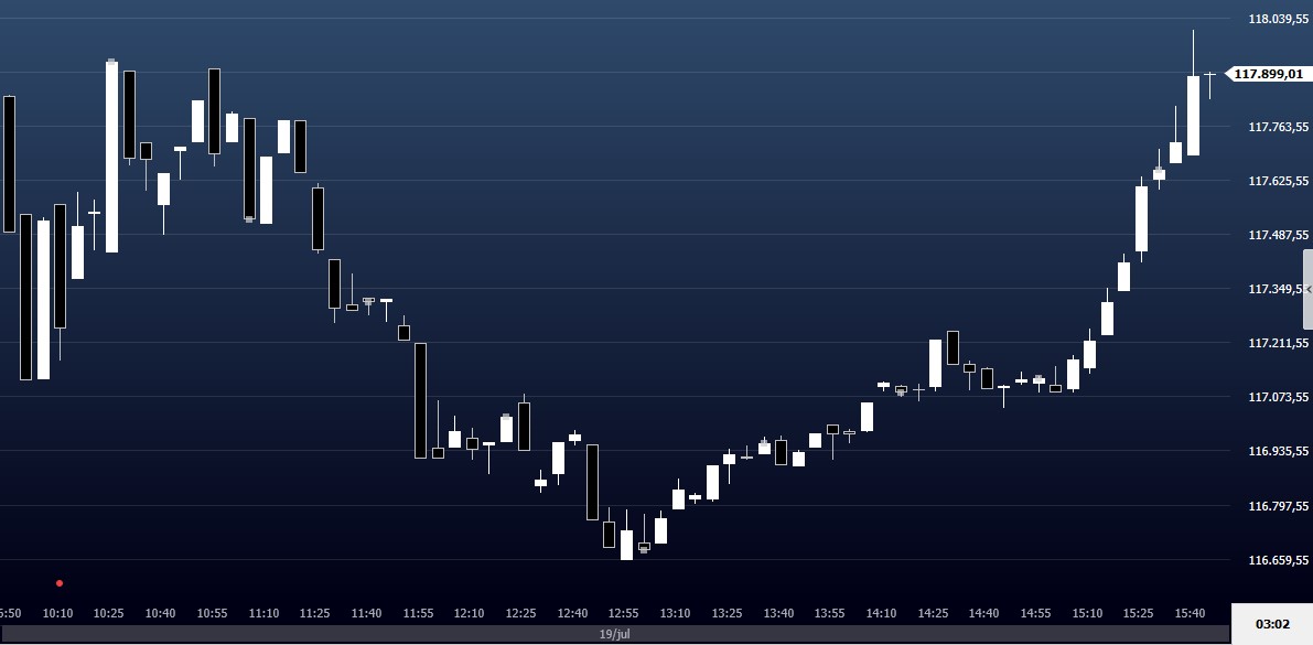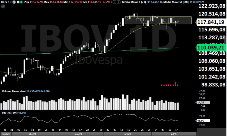Ao final do dia, o Ibovespa, que até chegou a virar para positivo e beliscar novamente os 118 mil, encerrou com queda de 0,25%, aos 117,5 mil pontos, mais uma vez na contramão de Wall Street, que fechou no azul, ainda embalado pelos balanços do 2T23. Já o dólar encerrou sequência de altas e ficou com menos 0,48%, a R$ 4,78.