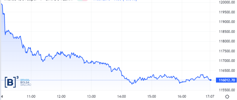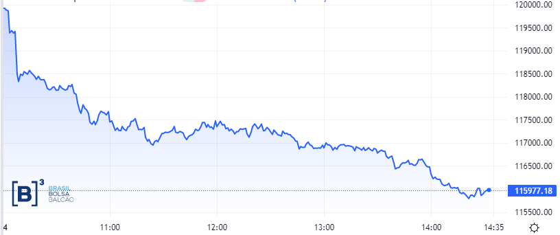 Ibovespa volta a perder os 116 mil: queda de 3,36%, aos 115.899,77 pontos